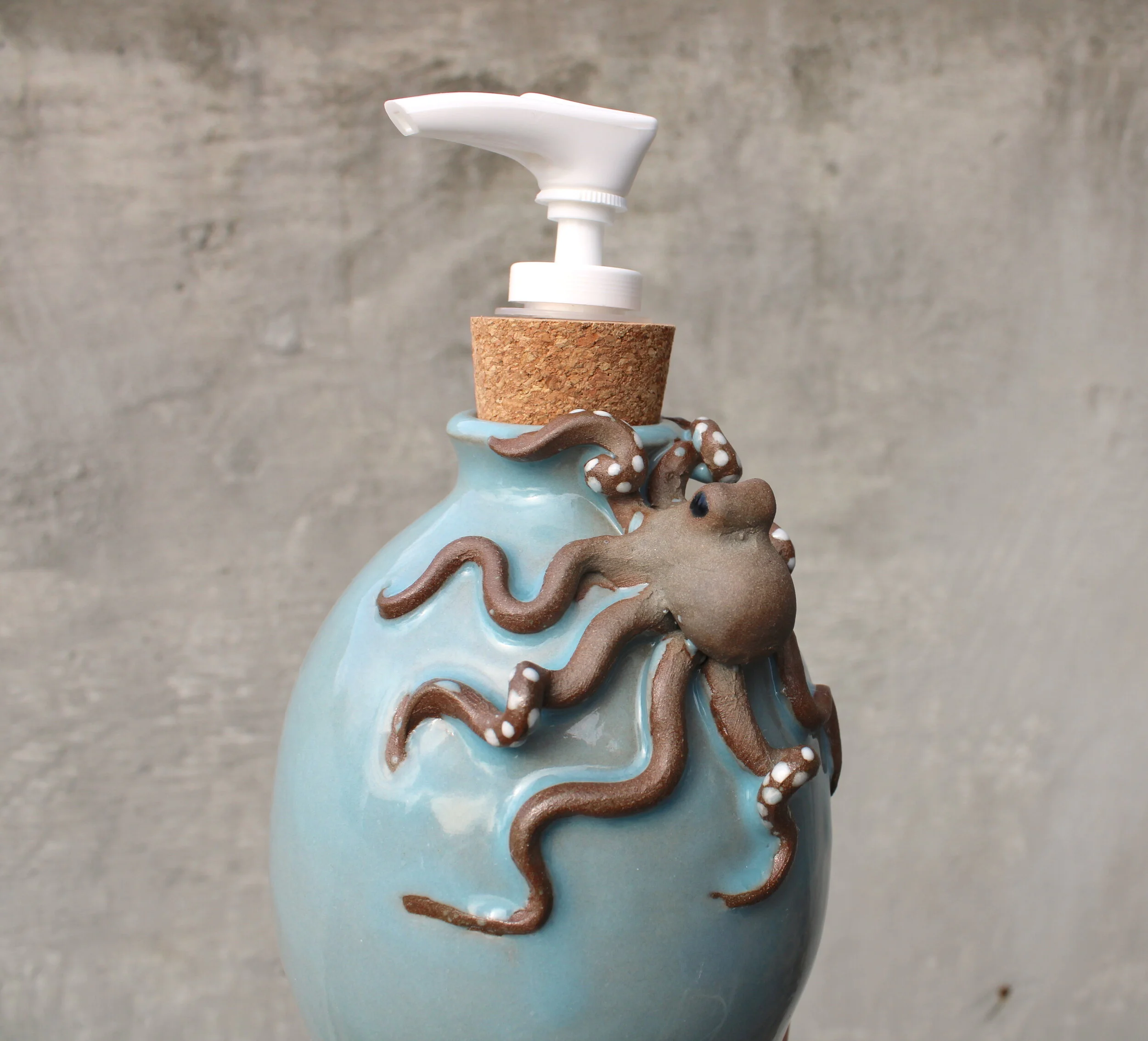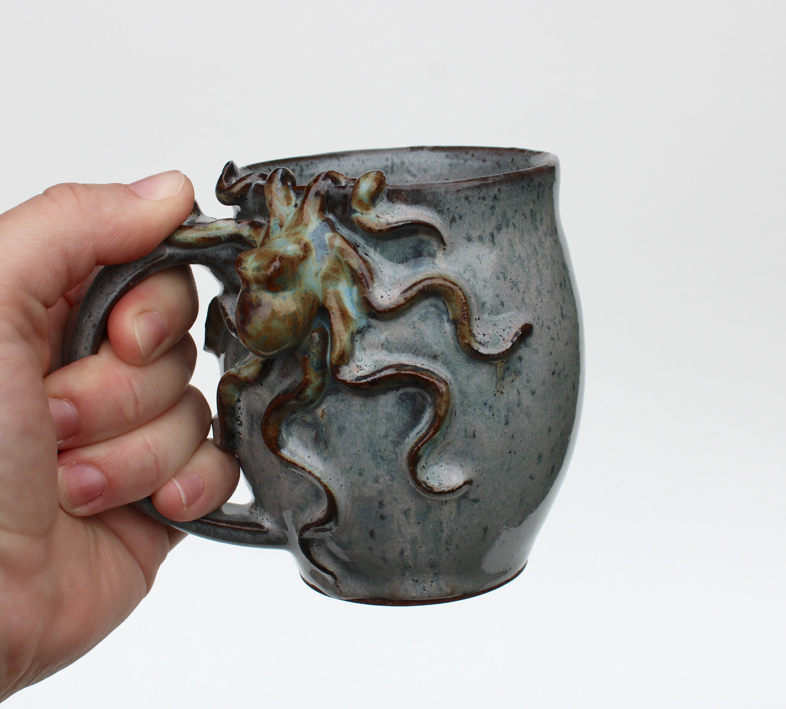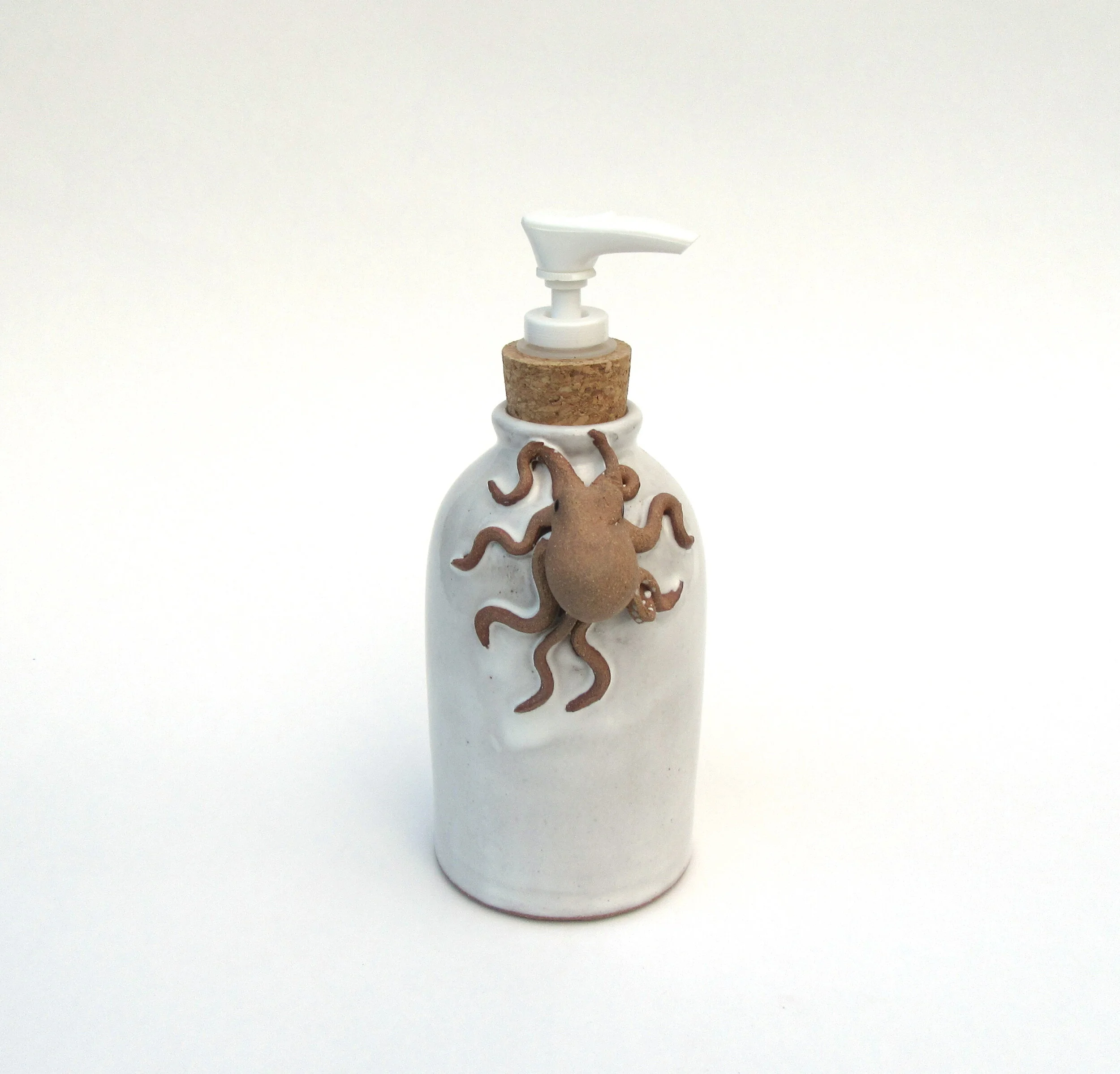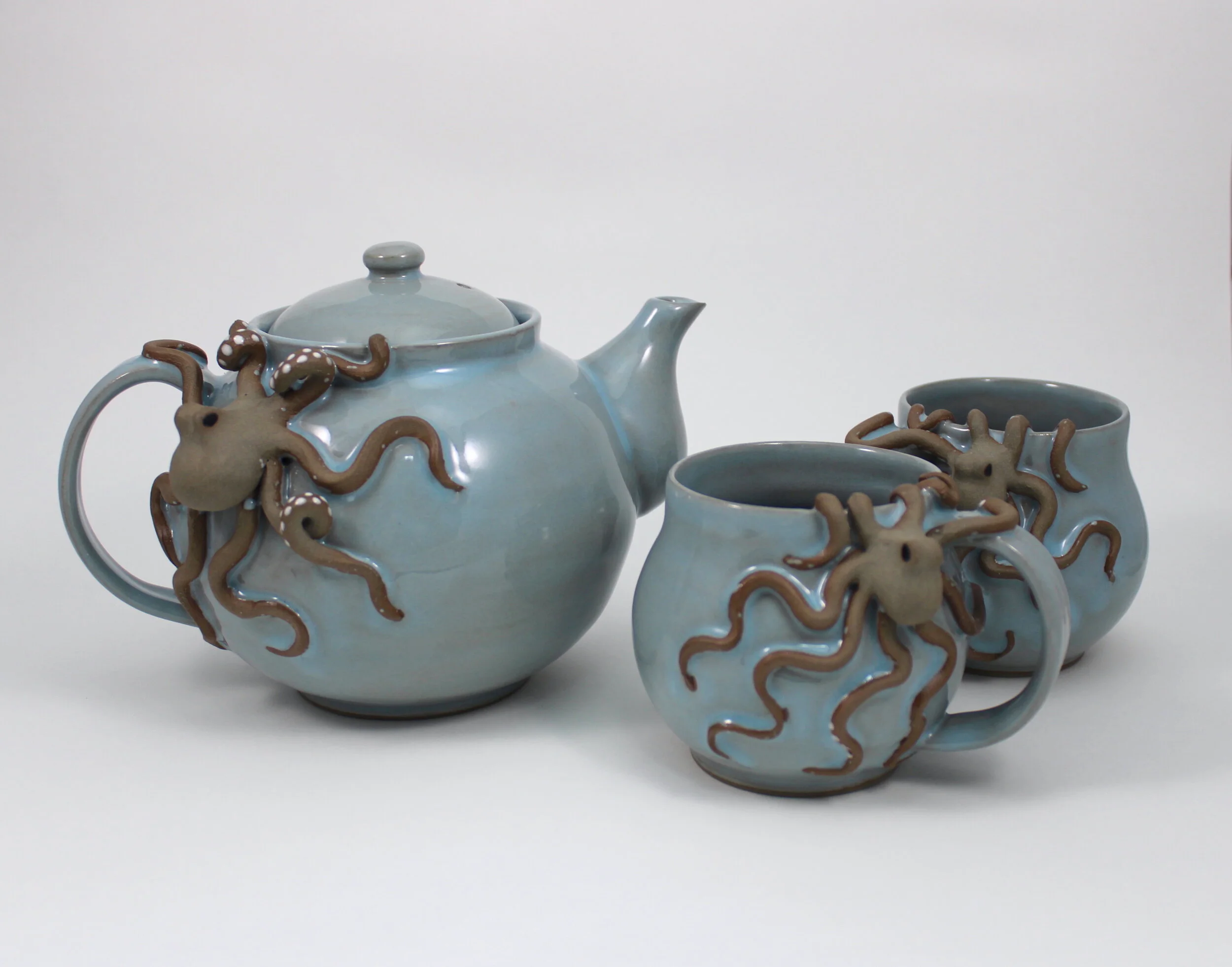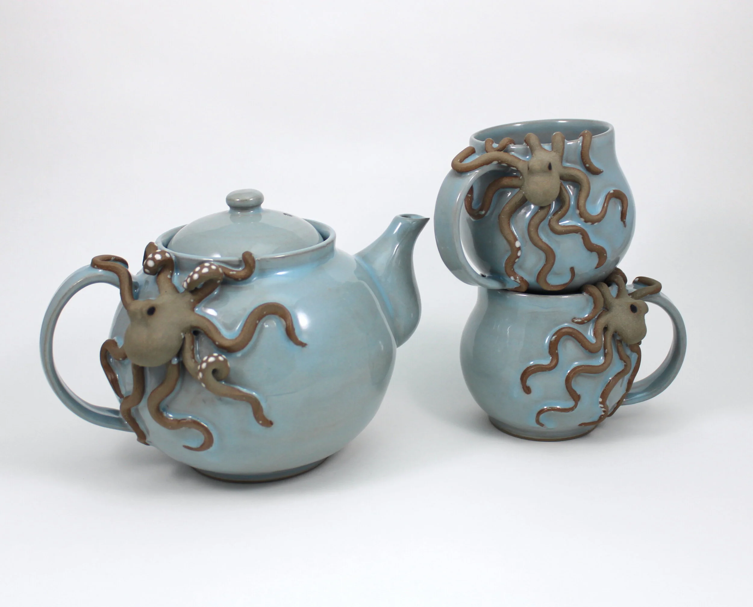 Pots of all kinds, including mugs, teapots, soap bottles, and vases, with hand sculpted octopus included.