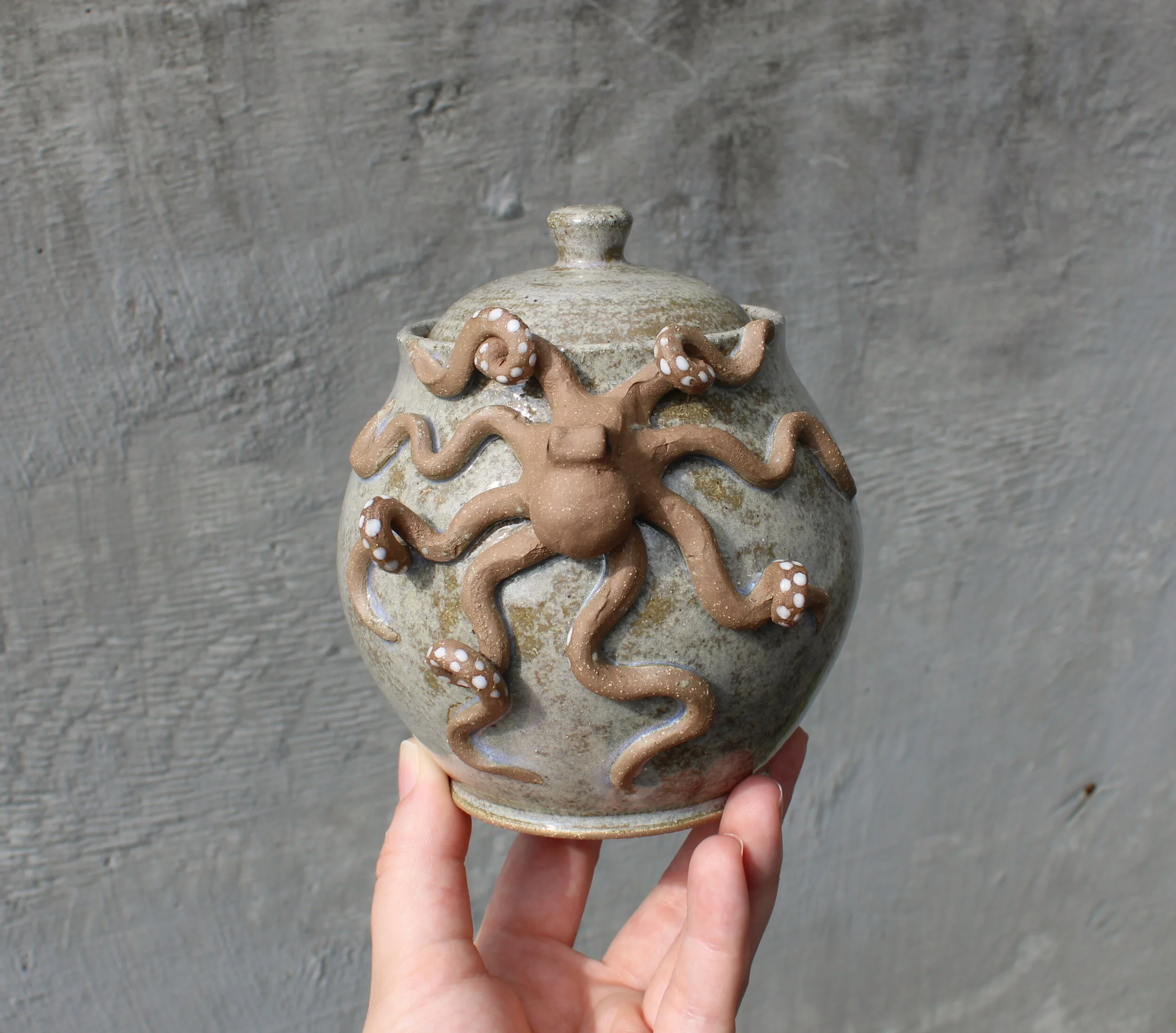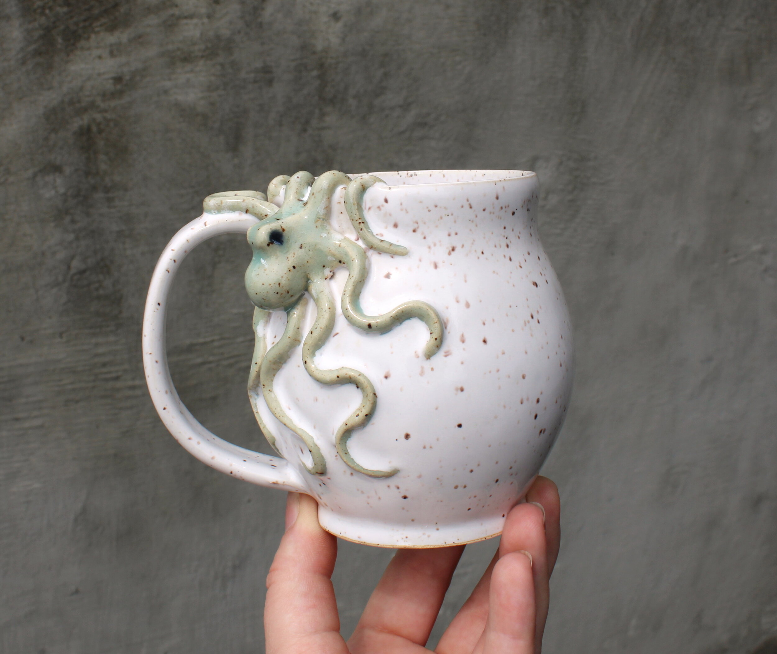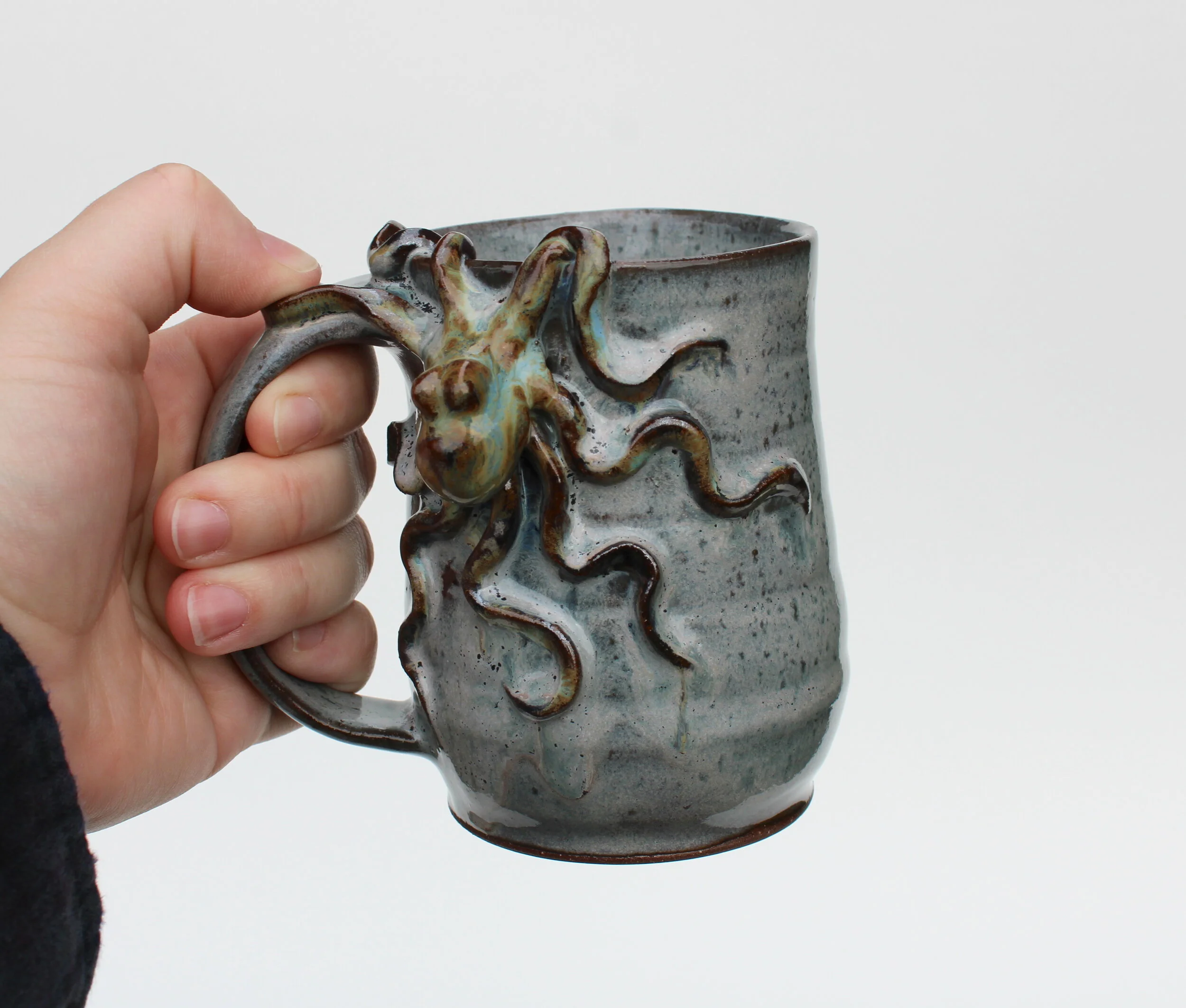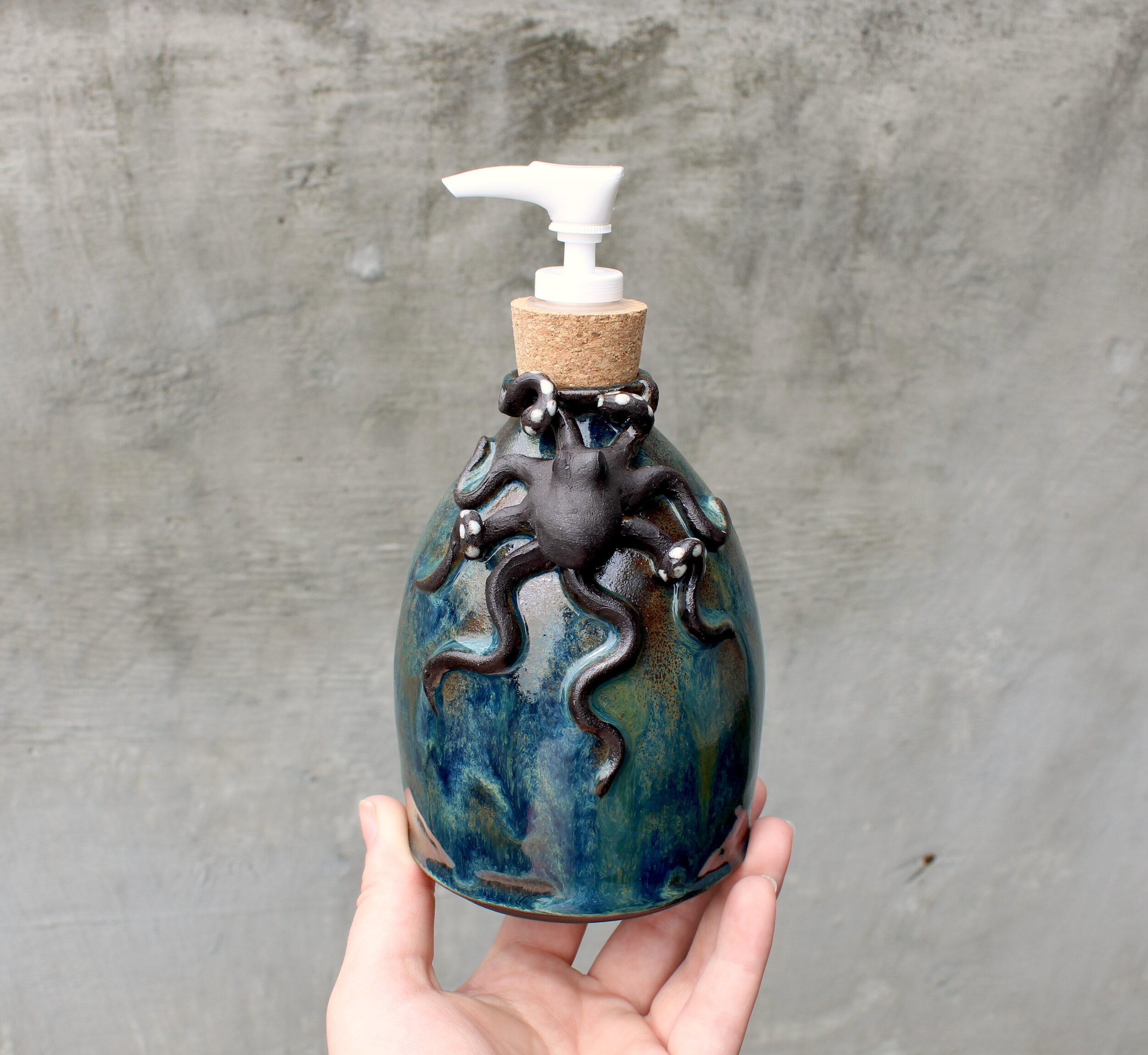 Pots of all kinds, including mugs, teapots, soap bottles, and vases, with hand sculpted octopus included.