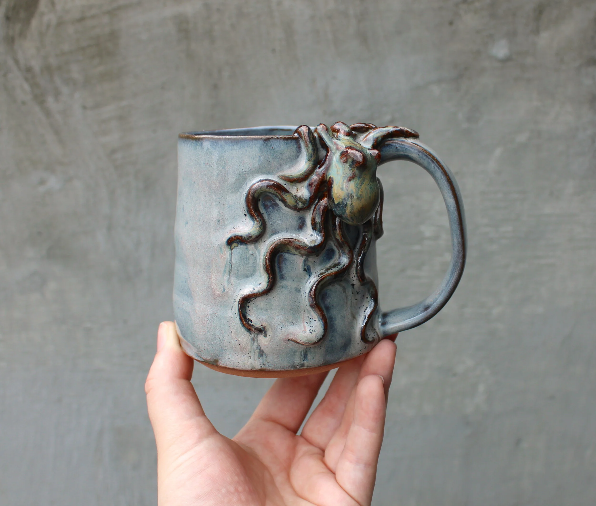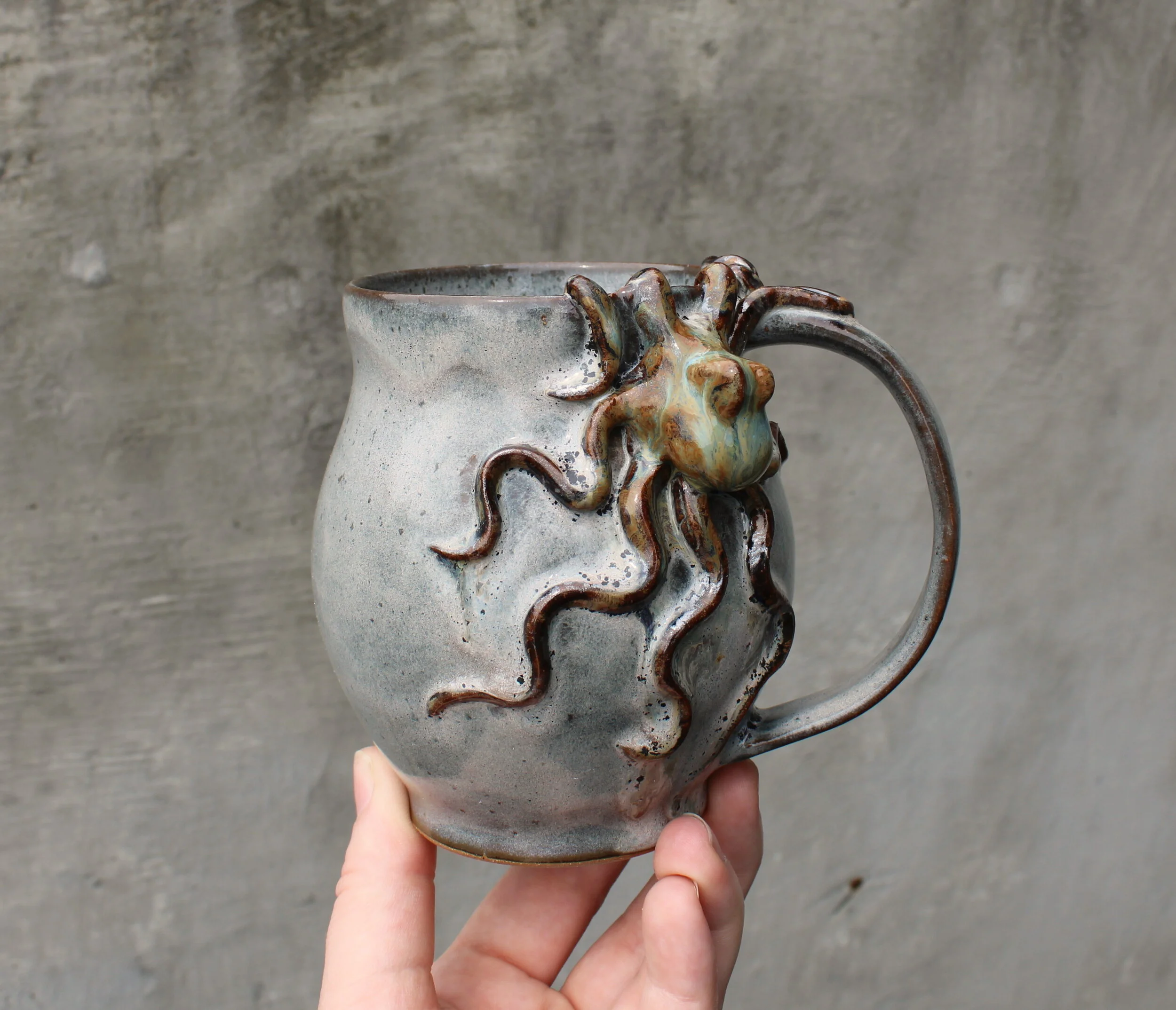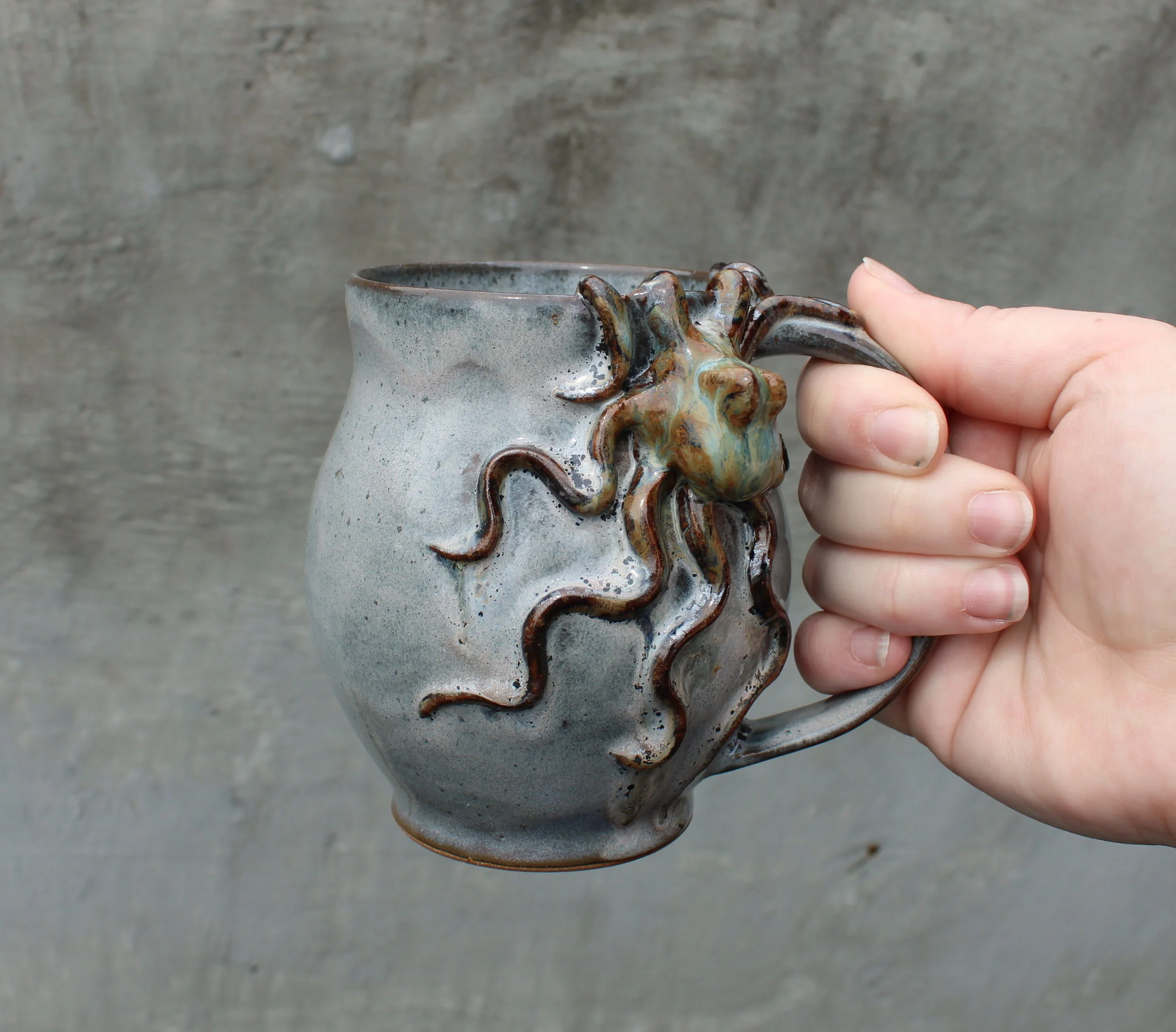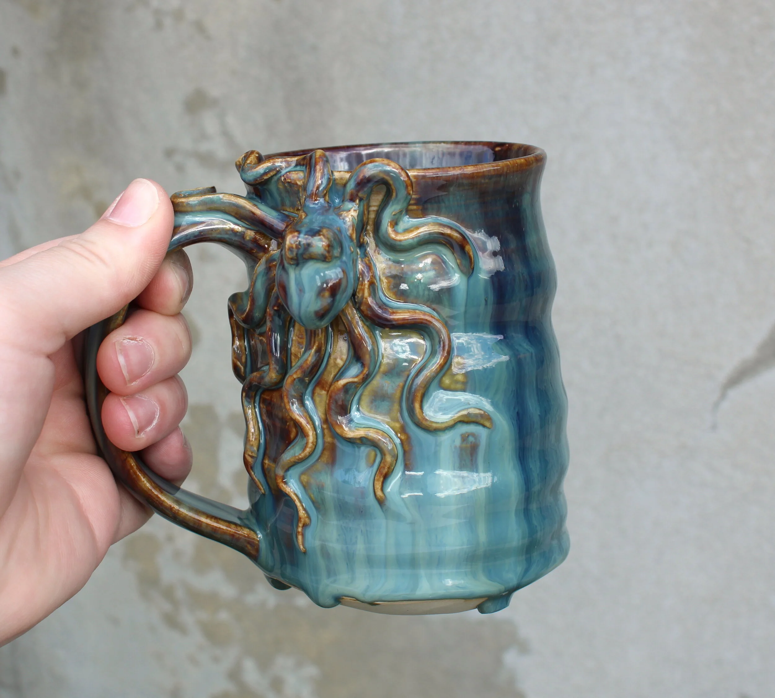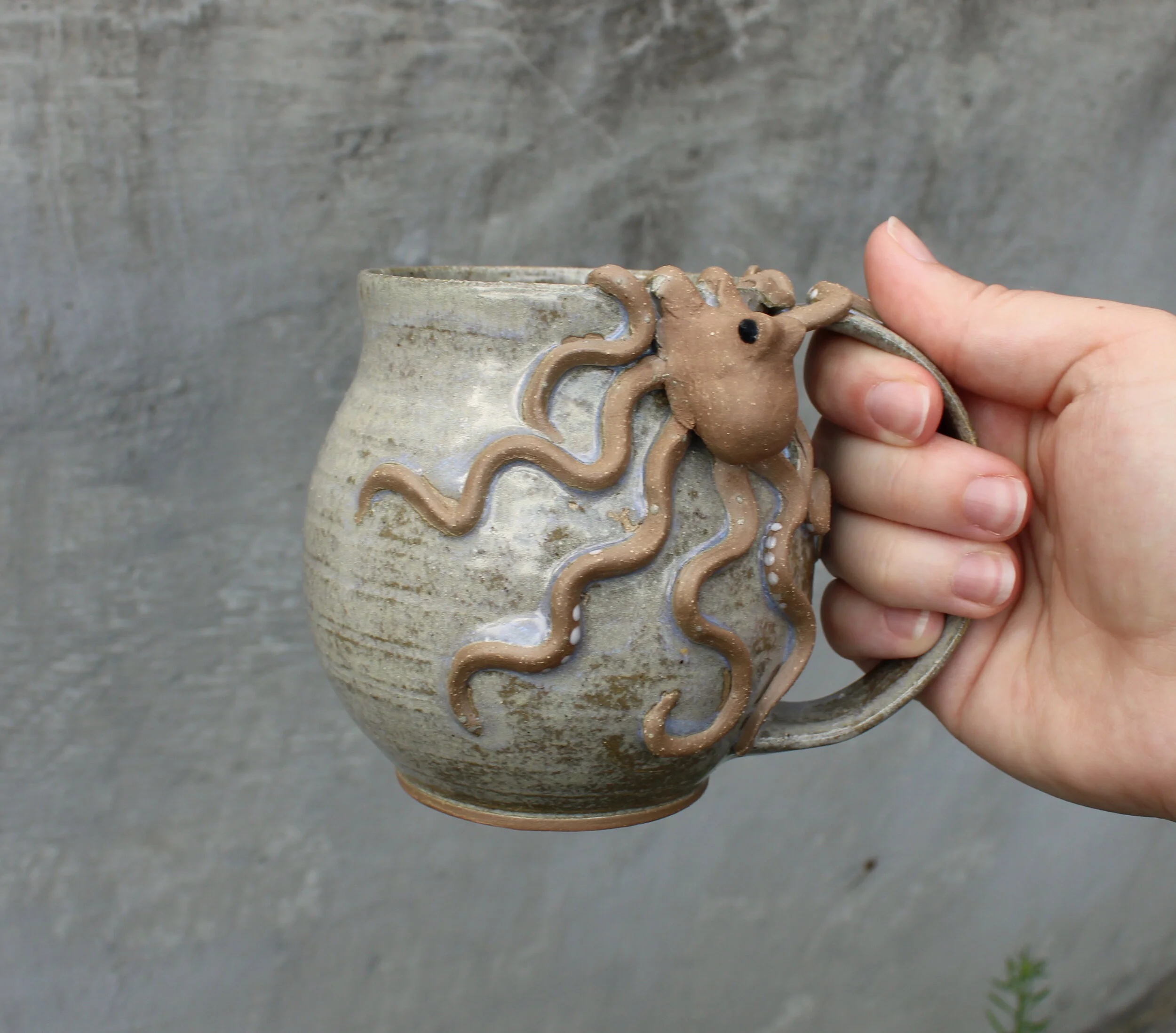 Pots of all kinds, including mugs, teapots, soap bottles, and vases, with hand sculpted octopus included.